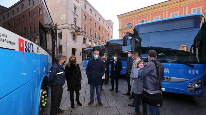 I nuovi mezzi extraurbani SETA di Piacenza e le linee guida del Piano triennale di investimenti 2021-2023 sono stati presentati ufficialmente alla cittadinanza ed agli organi di stampa questa mattina in Piazzetta Mercanti, alla presenza di: Patrizia Barbieri, Sindaco del capoluogo e Presidente della Provincia; Paolo Mancioppi (Assessore alla Mobilità del Comune di Piacenza); Antonio Nicolini, Francesco Patrizi e Fabio Callori (rispettivamente: Presidente, Amministratore delegato e Consigliere di Amministrazione di SETA Spa); Paolo Garetti e Paolo Ripamonti (Amministratore unico e Direttore di Tempi Agenzia).