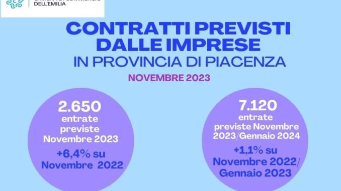 Nuovi contratti in aumento a Piacenza, si mantiene dinamico il mercato del lavoro nel territorio piacentino. Sono 2.650, infatti, i nuovi contratti previsti per il mese di novembre e 7.120 quelli per il trimestre novembre-gennaio. Sia su base mensile che trimestrale, i valori appaiono in crescita rispetto a quelli dello scorso anno +6,4% e +1,1%.