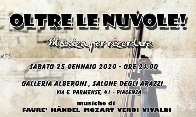 Oltre alle Nuvole, Musica per ricordare il 25 gennaio alla Galleria Alberoni. L’evento al Salone degli Arazzi inizierà alle ore 21. In programma musiche di Faudrè, Handel, Mozart, Verdi e Vivaldi.