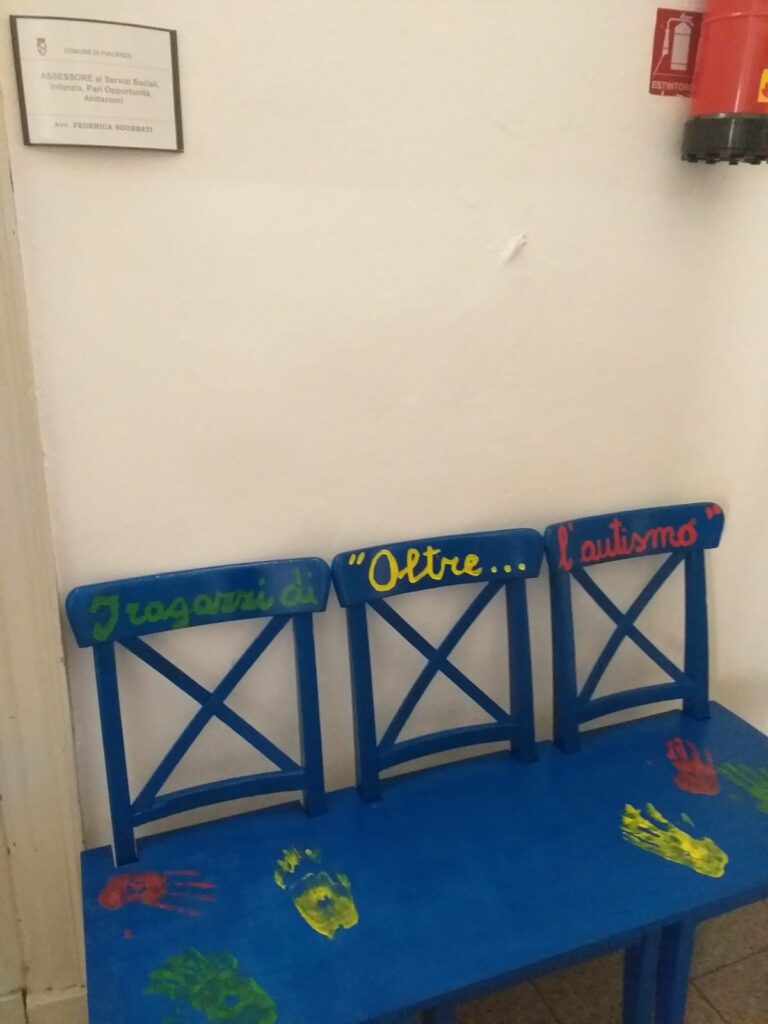Una “panchina” blu realizzata artigianalmente, dall’unione di tre sedie dipinte a mano. Le impronte di quelle stesse mani d’artista, di tanti colori diversi, impresse come firma. E la scritta, come una dedica: “I ragazzi di Oltre l’Autismo”.