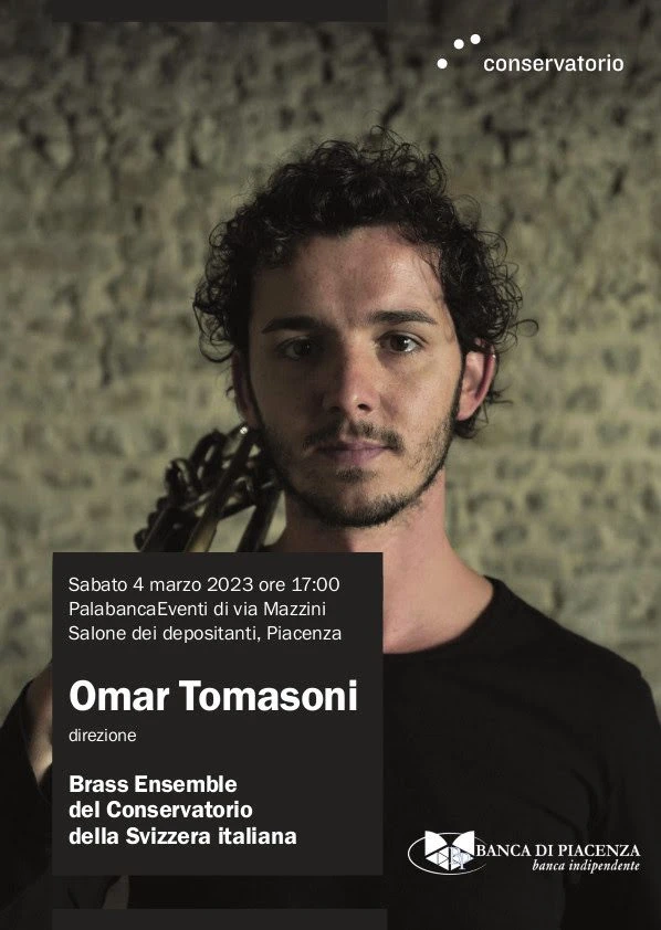 Al Salone dei depositanti, la Banca di Piacenza offre alla comunità piacentina un concerto per fiati del Brass Ensemble del Conservatorio della Svizzera italiana. Direzione e maestro concertatore, Omar Tomasoni, professore di tromba alla scuola universitaria del citato Conservatorio. Bresciano, 38 anni, Tomasoni dal 2013 è prima tromba solista della Royal Concertgebouworkest di Amsterdam e svolge un’intensa attività solistica e cameristica, in duo e con il famoso quintetto d’ottoni “Italian Wonderbrass”, di cui è membro fondatore.