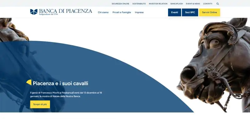 La Banca di Piacenza ha il suo nuovo sito web istituzionale, on line a partire dal 15 dicembre (bancadipiacenza.it). Completamente rinnovato nella grafica, nell’architettura dei contenuti e nell’esperienza utente, il progetto è stato pensato per rafforzare il rapporto con i clienti e riaffermare i valori che da sempre contraddistinguono l’Istituto: territorialità, relazioni interpersonali e indipendenza.