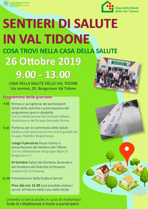 Open Day alla Casa della Salute della Val Tidone sabato 26 ottobre. Durante l’evento sarà presentata una guida realizzata da addetti ai lavori e volontari intitolata “Sentieri di salute in Val Tidone”. La struttura si trova a Borgonovo in via Seminò 20.