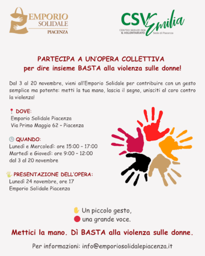 In occasione della Giornata Internazionale contro la Violenza sulle Donne, Emporio Solidale Piacenza e CSV Emilia propongono alla cittadinanza di partecipare a un’opera collettiva. Dal 3 al 20 novembre i cittadini possono recarsi all’ Emporio Solidale (via Primo Maggio 62, Piacenza) per lasciare l’impronta della propria mano.