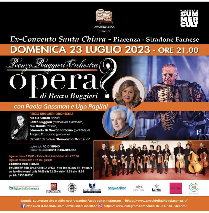 Opera? Renzo Ruggieri Orchestra, Paola Gassman e Ugo Pagliai in scena a Santa Chiara domenica 23 luglio alle ore 21 all’interno della rassegna Piacenza Summer Cult. Aperta la prevendita su Ticketone o presso la biglietteria degli Amici della Lirica di Piacenza.