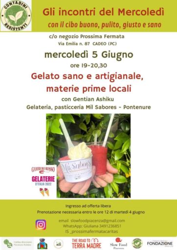 Con il supporto di Slow Food Piacenza e l’immancabile contributo delle attività locali come il Ristorante e Pizzeria Da Romano, l’azienda agricola Il Castello di Cadeo, il Comune di Cadeo e la parrocchia di Roveleto di Cadeo si svolgerà mercoledì 5 giugno l’ultimo appuntamento degli Incontri del Mercoledì con il cibo buono, pulito giusto e sano. Parteciperà Gentian Ashiku della gelateria e pasticceria Mil Sabores di Pontenure, artigiano del gusto e procacciatore di materie prime locali e genuine.