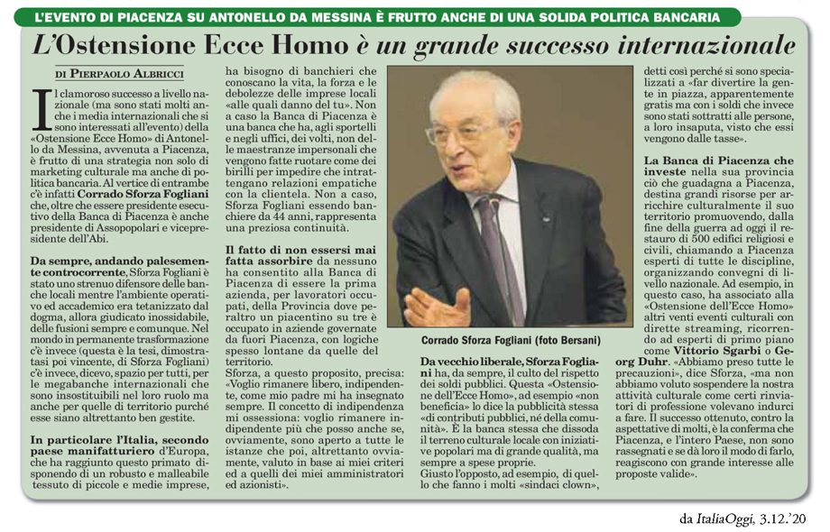 L’Ostensione dell’Ecce Homo continua a far parlare di sé a livello nazionale. Anche questa mattina l’evento trova spazio sulle pagine di ItaliaOggi, in un articolo firmato da Pierpaolo Albricci. Il giornalista parla di “clamoroso successo”.