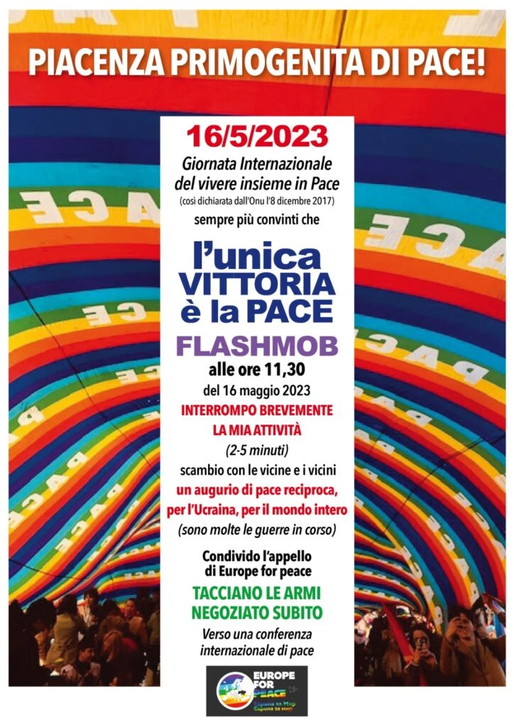 Il 16 maggio 2023 alle ore 11,30 , ogni singolo cittadino sarà invitato ad aderire all’iniziativa interrompendo per pochi minuti la propria attività e manifestando il proprio desiderio di Pace condividendo l’Appello di Europe for Peace.