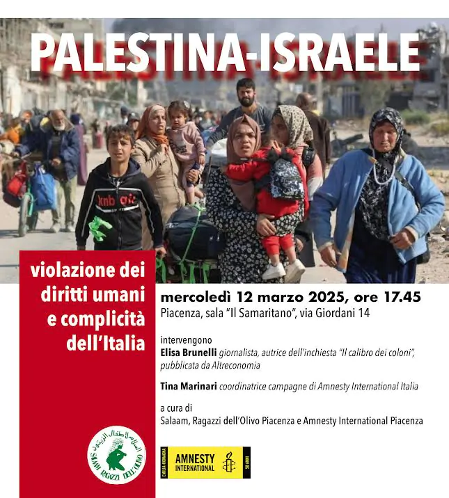 Evento di approfondimento sulla situazione Palestina-Israele “Violazione dei diritti umani e complicità dell’Italia”. Appuntamento mercoledì 12 marzo alle ore 17.45 presso la Sala Il Samaritano in Via Giordani 14 – Piacenza.