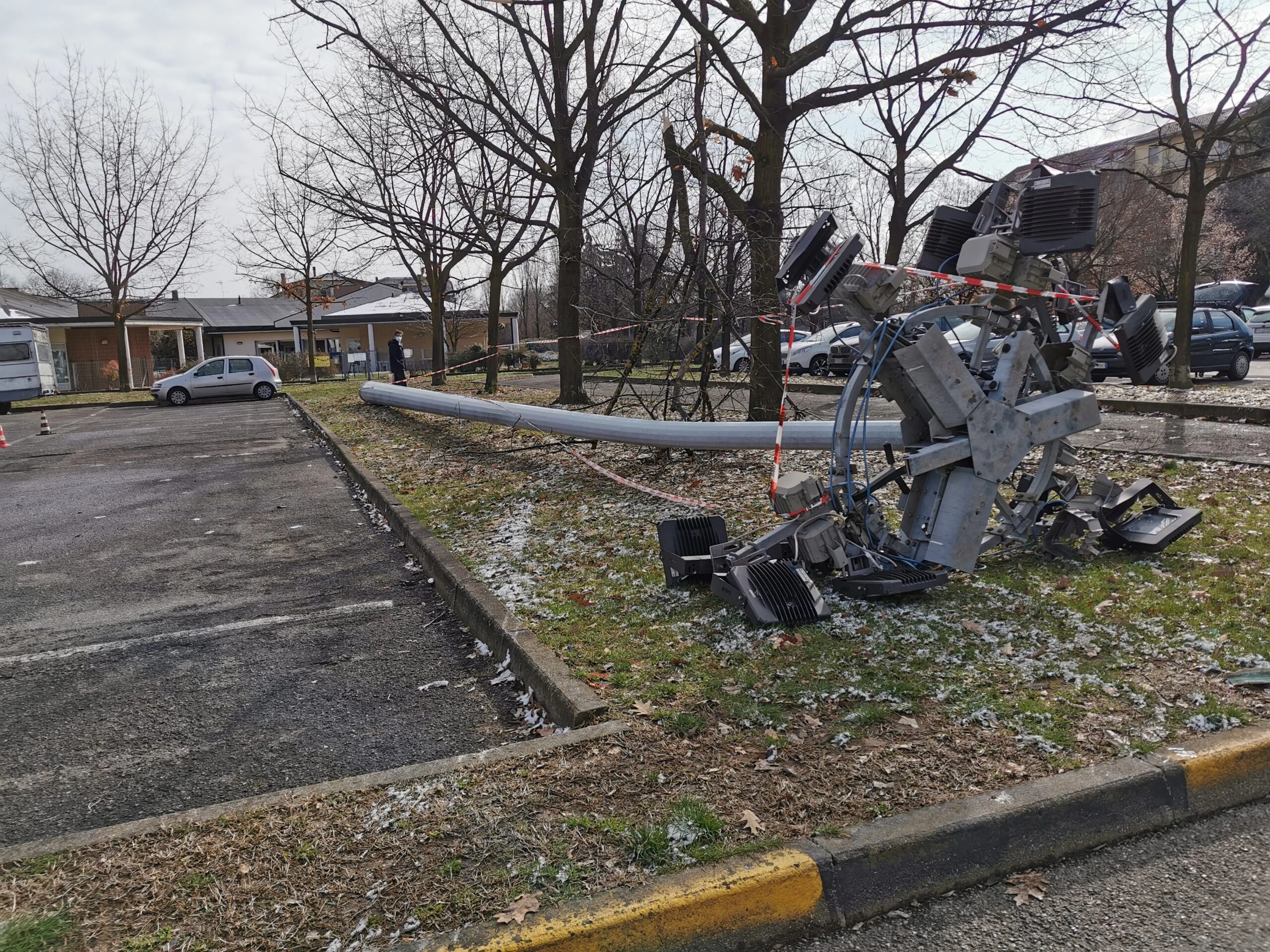 I fatti sono accaduti questa mattina intorno alle 10, nel parcheggio di via Trivioli. Si parla di un palo dell’illuminazione pubblica alto 15 metri.