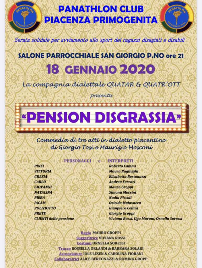 Il 18 Gennaio, nel salone parrocchiale di San Giorgio Piacentino, alle ore 21:00 andrà il scena il “Pension Disgrassia”. Spettacolo della compagnia dialettale “Quatar & Quatr’ott”.