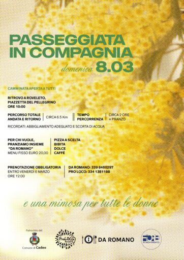 Festa della Donna 2026, Passeggiata in compagnia domenica 8 marzo a Roveleto. Il ritrovo è previsto presso la Piazzetta del Pellegrino alle ore 10.00. Il percorso totale di andata e ritorno circa 6.5 km.