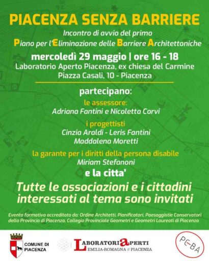 Mercoledì 29 maggio, dalle 16 alle 18, il Laboratorio Aperto nella ex chiesa del Carmine ospiterà l’incontro pubblico di avvio del percorso partecipativo legato al PEBA, il primo Piano per l’eliminazione delle barriere architettoniche di Piacenza.