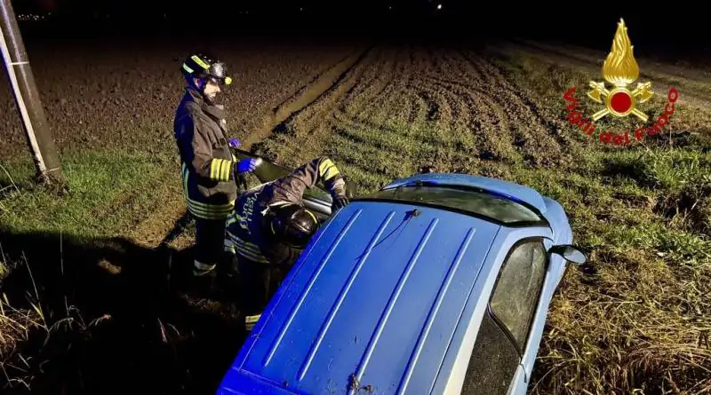 L’auto è uscita di strada ed è finita capovolta in un canale accanto alla carreggiata. Nonostante il maltempo, fortunatamente il canale era privo di acqua.