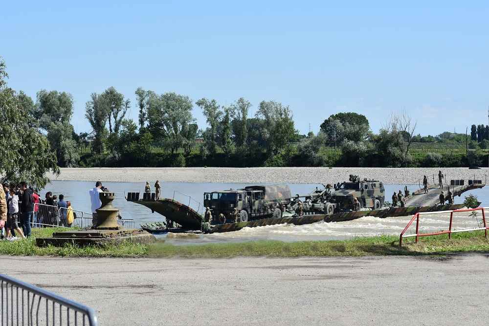 Per la parte esercitativa dinamica è stata simulata tramite la realizzazione di un traghetto con materiale da ponte P.G.M. (Ponte Galleggiante Motorizzato) il trasporto da una sponda all’altra del Po di un pezzo d’artiglieria e di un veicolo tattico medio multiruolo (VTMM) successivamente all’effettuazione di una ricognizione della sponda e all’esfiltrazione di un ferito causato da uno scontro a fuoco con elementi ostili.