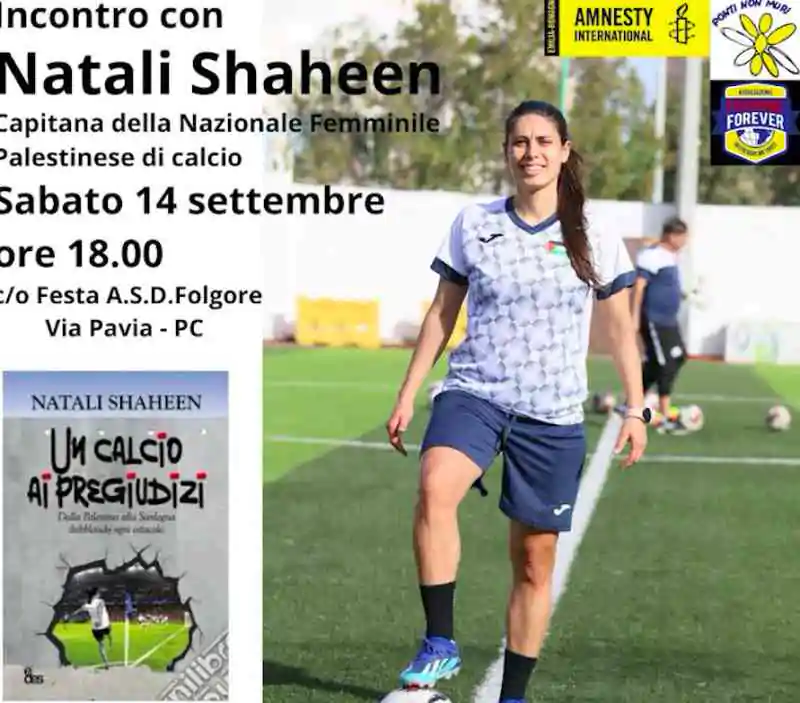 Piacenza abbraccia Natali Shaheen, simbolo di pace e diritti umani attraverso lo sport. E’ un’occasione speciale per incontrare Natali, già capitana della nazionale palestinese di calcio femminile che sarà sabato 14 settembre alle ore 18.00 alla festa per l’85° anniversario della A.S.D. Folgore di Via Pavia (quartiere Infrangibile) dove durante il giorno si svolgerà un torneo di calcio a squadre.