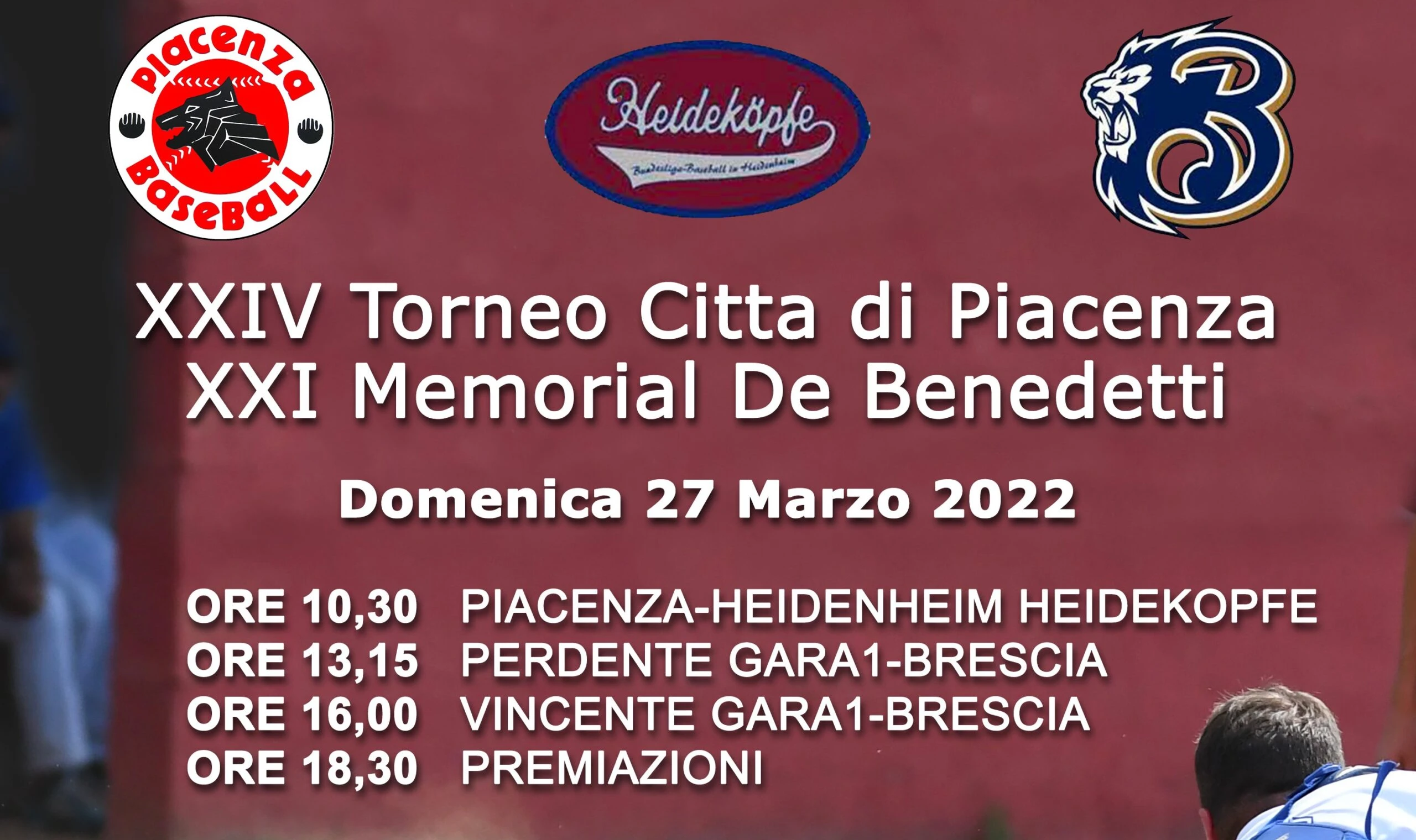 Dopo qualche anno di assenza torna domenica il Torneo Città di Piacenza – Memorial Giovanni De Benedetti. Giunto alla sua ventiquattresima edizione, questa volta si presenta come triangolare tra il Piacenza Baseball di Giangio Marenghi, il Brescia ed i tedeschi dell’Heidenheim Heidekopfe.