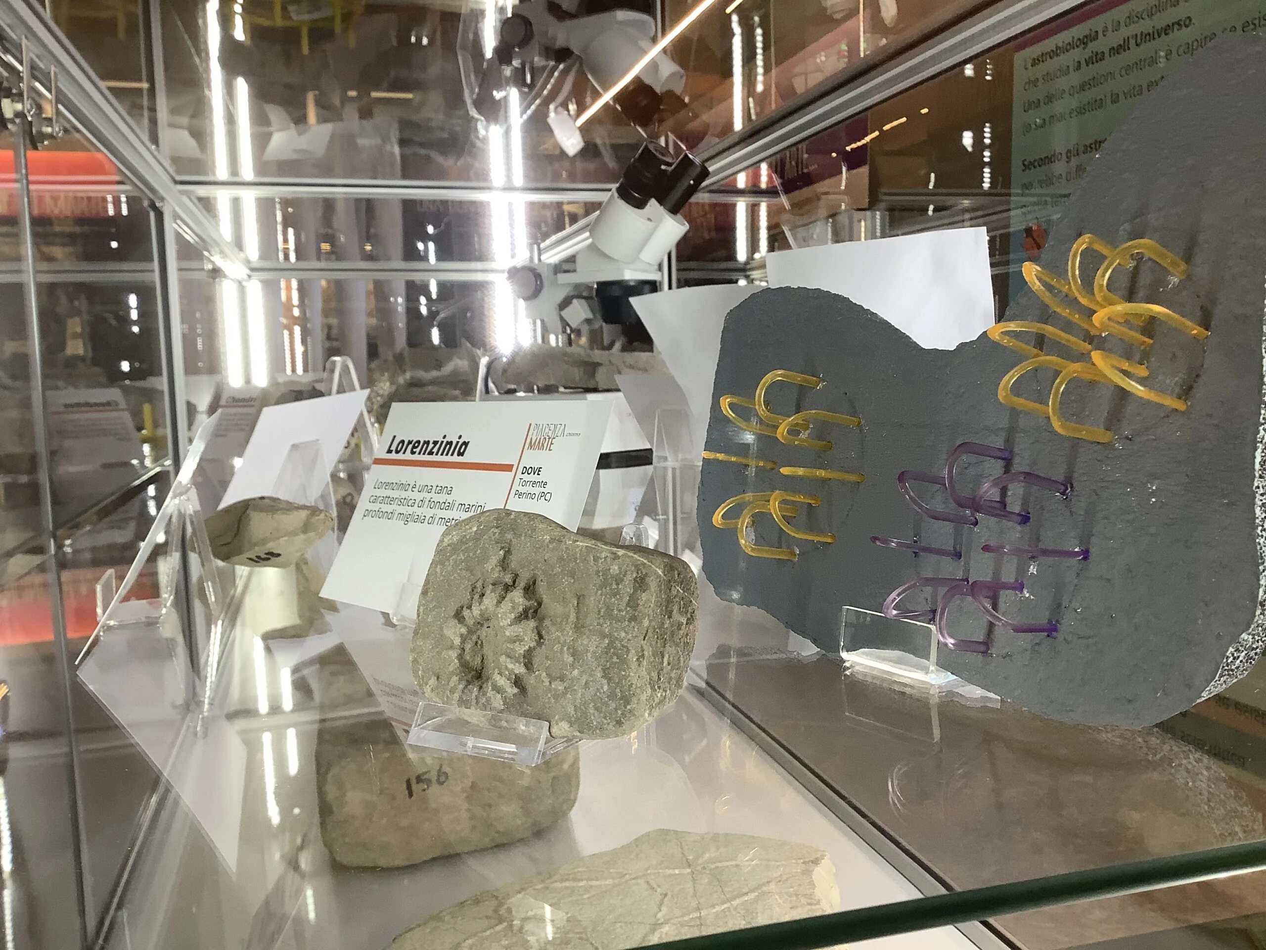 “La mostra – ha detto Annarita Volpi – guiderà il visitatore attraverso uno straordinario percorso che, partendo da ricerche scientifiche realizzate nel territorio piacentino, lo porterà fino su Marte, offrendogli gli strumenti per identificare la presenza di segni di un’eventuale attività biologica su altri pianeti e in particolare sul Pianeta Rosso”. Ha aggiunto Girolamo Lo Russo: “Questa straordinaria possibilità viene data dallo studio delle tracce lasciate da organismi nel corso della loro vita. Le rocce del territorio piacentino custodiscono esempi evidenti di attività biologica, esistita milioni di anni fa, sui fondali di un antico oceano. Questi studi convergono in una disciplina chiamata: paleoicnologia (studio di antiche tracce). Oltre ai reperti icnologici sarà visibile una ricostruzione 3D di una parte di suolo marziano, con enigmatiche strutture, che potrebbero risultare tracce biologiche. Su tre diversi schermi sarà inoltre possibile seguire particolari momenti della ricerca e della realizzazione di elaborati 3D. Un video presenta in modo più esaustivo il valore scientifico della ricerca icnologica”.