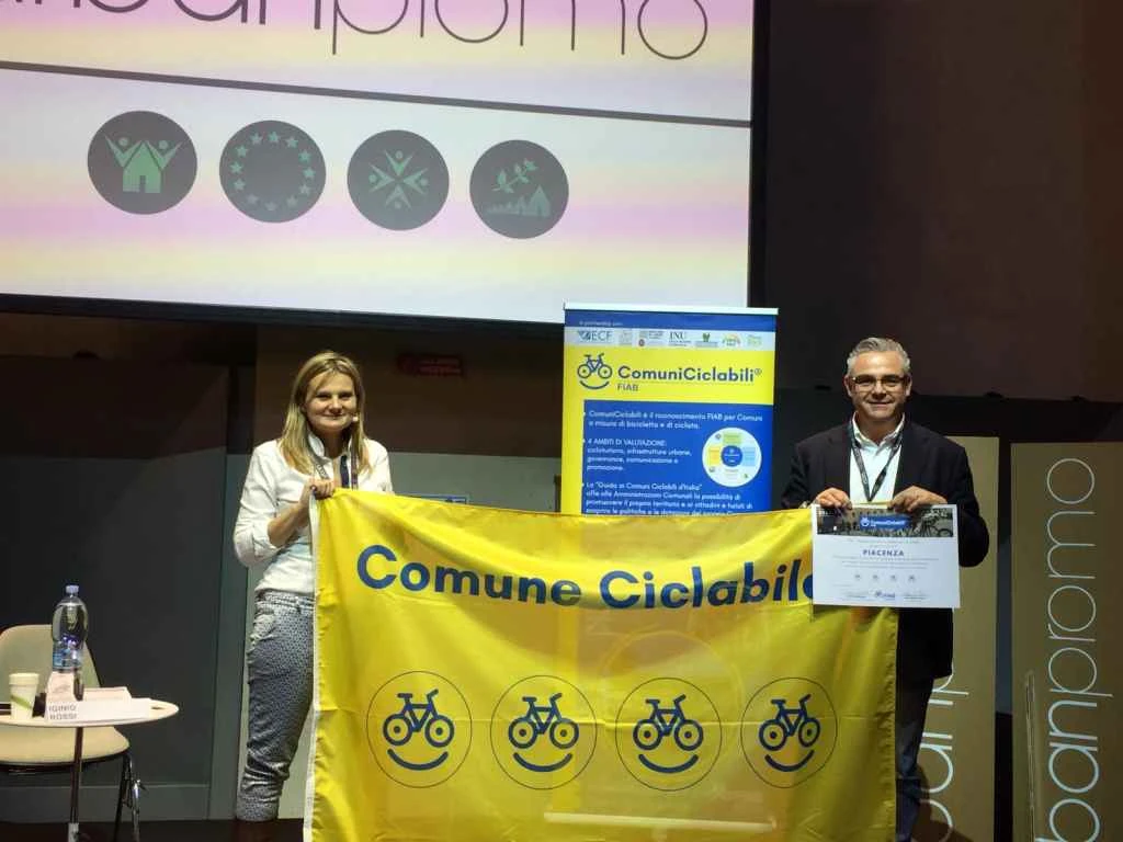 Piacenza ha ricevuto, per il secondo anno consecutivo, il riconoscimento di ComuneCiclabile rilasciato da Fiab. Con questa motivazione: “per l’impegno nella promozione e nella realizzazione di infrastrutture e politiche a favore della Bicicletta”. In particolare confermando la valutazione di 4 bike-smile – l’equivalente, a due ruote, delle stelle – ottenuta nel 2018. L’attestato, unitamente alla bandiera gialla d’ordinanza, è stato consegnato all’assessore a Mobilità e Ambiente Paolo Mancioppi nei giorni scorsi presso Palazzo Lavazza a Torino. In occasione della cerimonia tenutasi all’interno del workshop “Reti per la mobilità sostenibile”, promosso dall’Istituto nazionale di Urbanistica in collaborazione con Fiab-ComuniCiclabili.