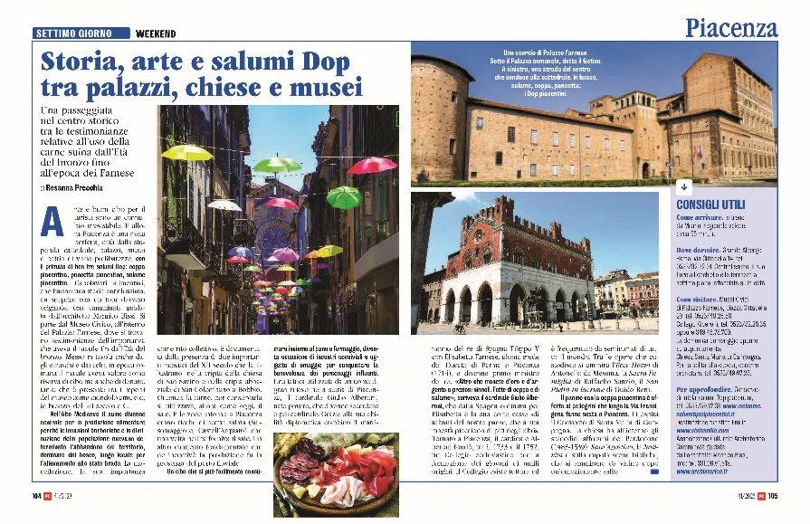 È il frutto della partecipazione al Press Tour organizzato dal Consorzio Salumi DOP Piacentini il 16 e 17 settembre, in concomitanza con la manifestazione “Piacenza è un Mare di Sapori”. L’articolo, di due pagine, è pubblicato nella rubrica Weekend, dove la giornalista suggerisce di passarlo a Piacenza con tutta una serie di suggerimenti di posti da vedere, esplorare e gustare. Dal Museo Civico di Palazzo Farnese con testimonianze dell’importanza che aveva il maiale fin dall’età del bronzo, alla Chiesa di Santa Maria di Campagna con la salita alla cupola per ammirare gli affreschi del Pordenone. Dal Collegio Alberoni con il capolavoro dell’Ecce Homo di Antonello da Messina alla Chiesa di San Savino.
