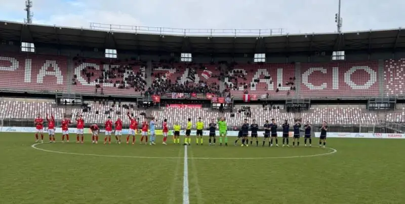 Iniziata al “Garilli”. Classica maglia biancorossa per il Piacenza, maglia scura per gli ospiti.