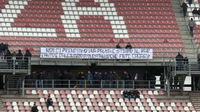 Il Piacenza fa il suo dovere e batte l’ultima in classifica Tuttocuoio 4-0. La domenica dei biancorossi è felice solo per il risultato: la squadra ha dovuto fare a meno dei suoi tifosi, il gruppo organizzato dei sostenitori ha disertato la gara in aperta contestazione con il gruppo guidato dall’allenatore Arnaldo Franzini. Sugli spalti uno striscione recita: “Noi ci prendiamo una pausa e stiamo al bar, tanto è dall’inizio dell’anno che fate c*”