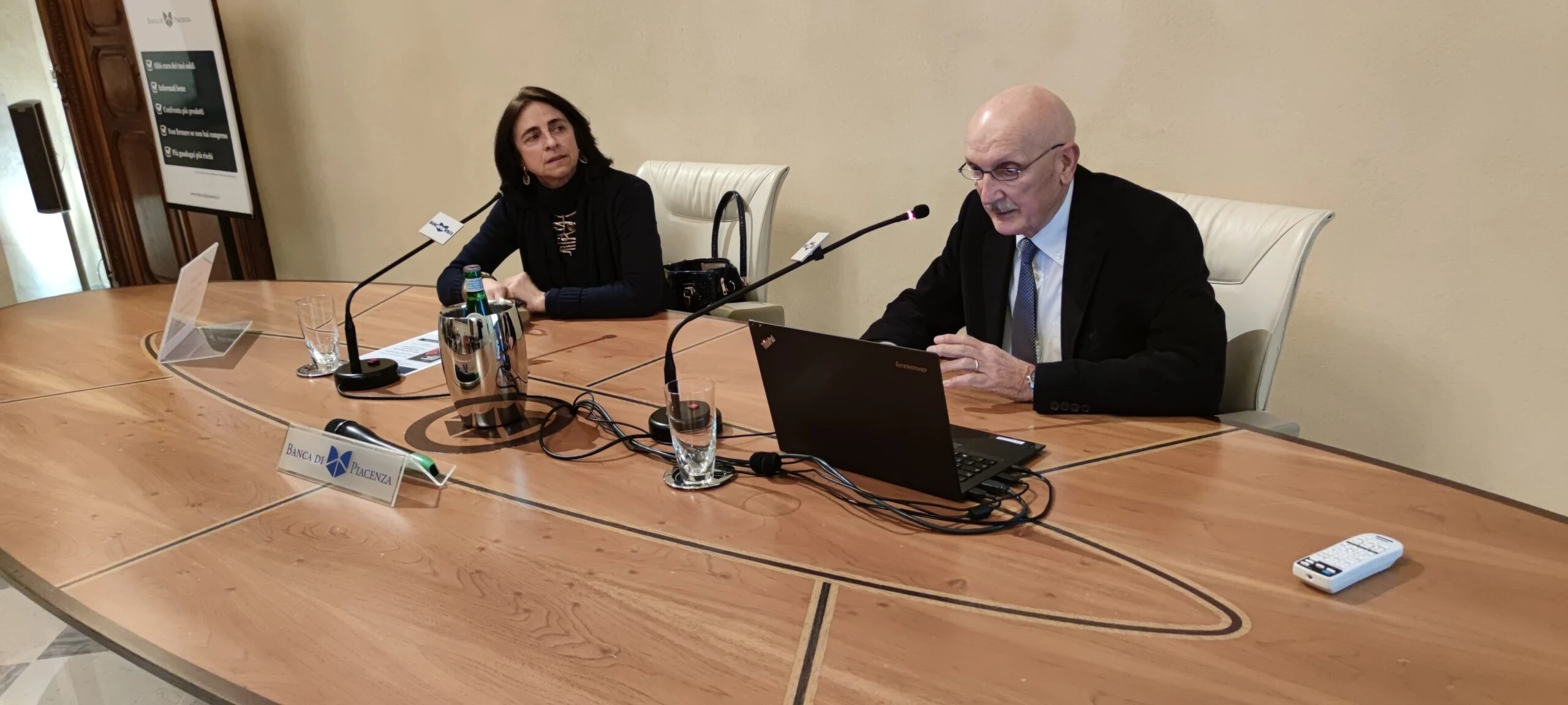 L’oratore ha quindi riferito notizie e curiosità riguardanti i principali monumenti della Piazza: la chiesa di San Francesco con il suo magnifico portale rinascimentale; il torrazzo di San Francesco; la chiese di San Bartolomeo e di Santa Maria, abbattute nel 1281 per far posto a Palazzo Gotico (del quale sono state illustrate le varie trasformazioni, come la costruzione e la successiva eliminazione del balconcino); la Madonna di Piazza (che subì diversi “traslochi”), i Cavalli farnesiani; il Palazzo del Governatore; il Palazzo del Collegio dei Mercanti (dove c’era il Teatro dei Filodrammatici e attuale sede del Comune); il Palazzo del Collegio dei Notai (che fu sede della Banca Popolare Piacentina); la loggetta sulla piazzetta delle Grida, che ritroviamo nel dipinto di Jacques François Carabain (1894, collezione Banca di Piacenza) esposto in mostra.