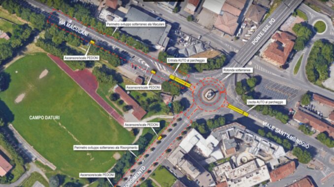 La proposta prevede la realizzazione, sotto Viale Risorgimento e sotto il tratto iniziale di Viale Maculani, di circa 348 posti auto (più dei 260 di piazza Cittadella) accessibili da rampe poste presso piazzale Milano, quindi in coincidenza con il margine nord della città storica.