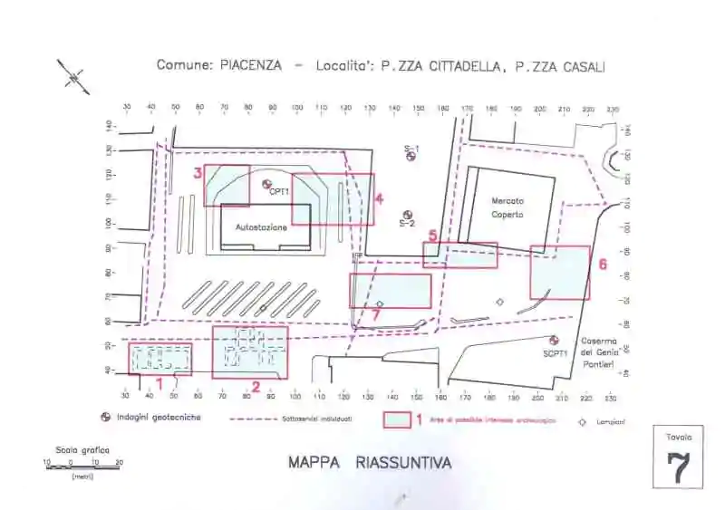 L’indagine geofisica, fatta dai tecnici di Geosystem, indica l’esistenza di ben sette aree di evidente rischio archeologico tra le due piazze Cittadella e Casali. Due di questi settori insistono direttamente sull’area di scavo del parcheggio interrato di Piazza Cittadella. La cosa interessante è che questa relazione dice che si sarebbero dovute fare ulteriori indagini di approfondimento ricorrendo proprio al georadar però, per quello che ci risulta ad oggi, questo non è stato fatto.