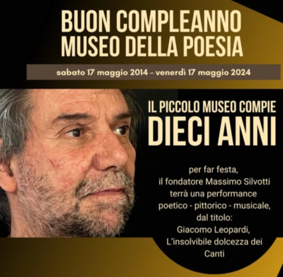 Il Piccolo Museo della Poesia compie dieci anni. Per l’occasione sabato 17 maggio 2014, a partire dalle ore 21, presso la Chiesa di San Cristoforo, Massimo Silvotti presenta la performance poetico – pittorica: Giacomo Leopardi, l’insolvibile dolcezza dei Canti con inserti musicali a cura di Rinascimusica.