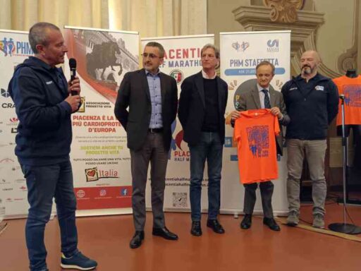 Sono intervenuti anche i sostenitori principali della Placentia Half Marathon: Robert Gionelli, Fondazione Piacenza e Vigevano Contributo liberale; Mario Bianchi, Amministratore Delegato di New Wave Italia (Craft, sponsor tecnico), Banca di Piacenza Main Sponsor, che hanno consegnato al Prefetto, insieme agli organizzatori della PHM Alessandro Confalonieri e Pietro Perotti, la maglietta ufficiale della PHM.