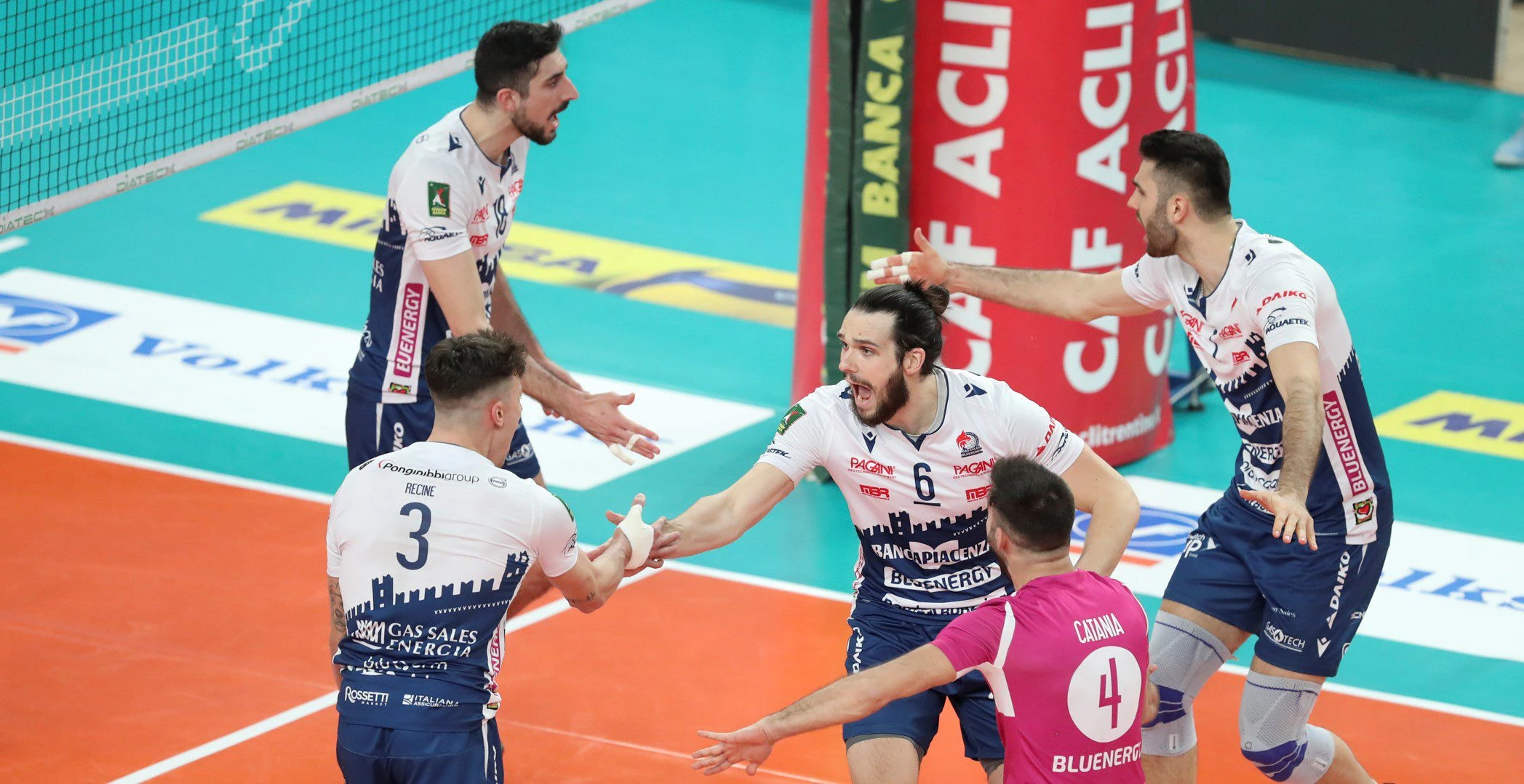 Bernardi non può contare su Scanferla, così propone Brizard in regia, Lagumdzija opposto, Holt e Caneschi centrali, Recine e Rossard schiacciatori con Catania, all’esordio dall’inizio, da libero.
