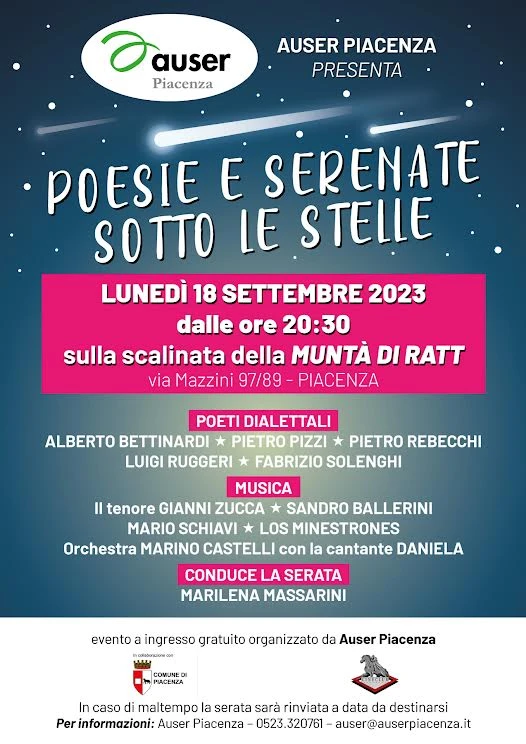 POESIE E SERENATE SOTTO LE STELLE LUNEDÌ 18 SETTEMBRE 2023 dalle ore 20:30 sulla scalinata della MUNTÀ DI RATT via Mazzini 97/89 – PIACENZA