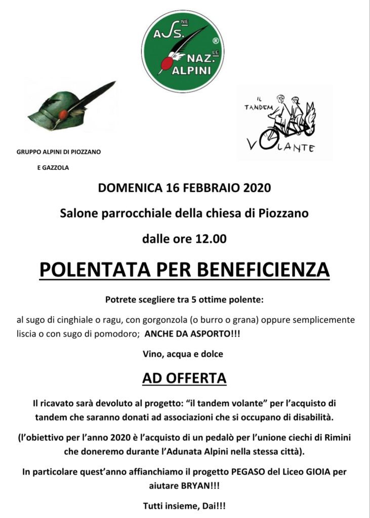 Polentata per beneficenza a Piozzano domenica 16 febbraio. L’evento con gli alpini e il progetto “Tandem Volante” è in programma dalle ore 12 nel salone Parrocchiale.