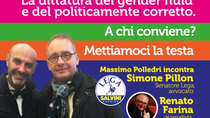 “La dittatura del gender fluid e del politicamente corretto. A chi conviene?” E’ il titolo dell’incontro che si terrà domani sera in Sant’Ilario e che vedrà Massimo Polledri, candidato con la Lega alle prossime elezioni, insieme a Simone Pillon, senatore della Lega, e il giornalista Renato Farina. Appuntamento alle 18.