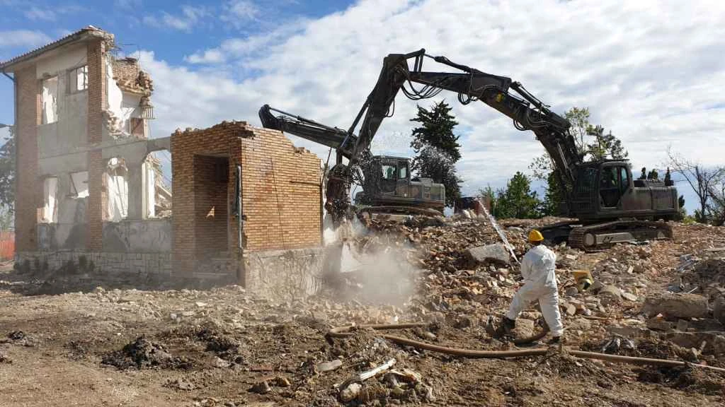 La complessità dell’intervento, parti dell’edificio per esempio raggiungevano un’altezza di circa 15 metri, ha richiesto una demolizione per fasi, effettuata con i mezzi speciali del genio e nella fattispecie due escavatori cingolati a benna rovescia di cui uno equipaggiato con pinza frantumatrice. È stata impiegata anche un’autobotte necessaria per irrorare d’acqua il punto di taglio della pinza al fine di abbattere le polveri prodotte.
