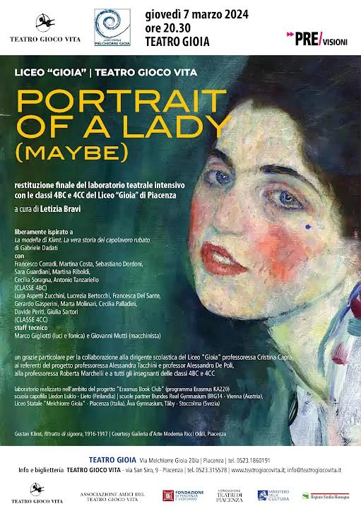 Quale storia si nasconde dietro al volto raffigurato nel “Ritratto di signora” di Klimt? Proverà a raccontarcelo attraverso i linguaggi del teatro un gruppo di studenti e studentesse delle classi 4B e 4C Classico del Liceo Gioia di Piacenza che giovedì 7 marzo alle ore 20.30 al Teatro Gioia sarà protagonista della performance “PORTRAIT OF A LADY (maybe)” restituzione finale di un laboratorio teatrale intensivo di Teatro Gioco Vita condotto da Letizia Bravi.