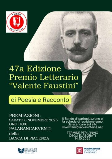 Istituito anche quest’anno dal Consiglio direttivo della Famiglia Piasinteina il Premio Valente Faustini, giunto alla 47a edizione, organizzato dalla stessa Famiglia Piasinteina con il sostegno della Banca di Piacenza, presente fin dalla prima edizione, e dalla Fondazione di Piacenza e Vigevano.