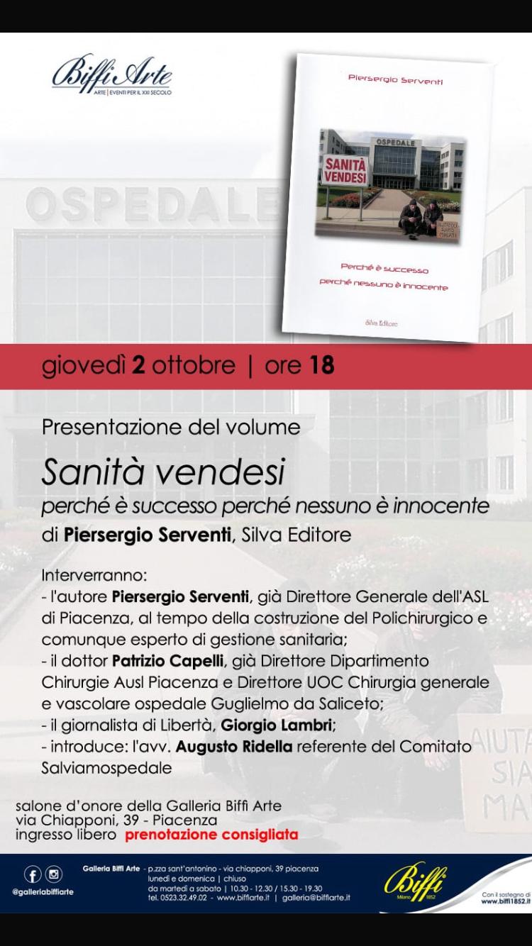 Giovedì 2 ottobre alle 18, al Salone d’onore della Galleria Biffi Arte in via Chiapponi sarà presentato il libro “Sanità Vendesi – perché è successo, perché nessuno è innocente” di Piersergio Serventi.