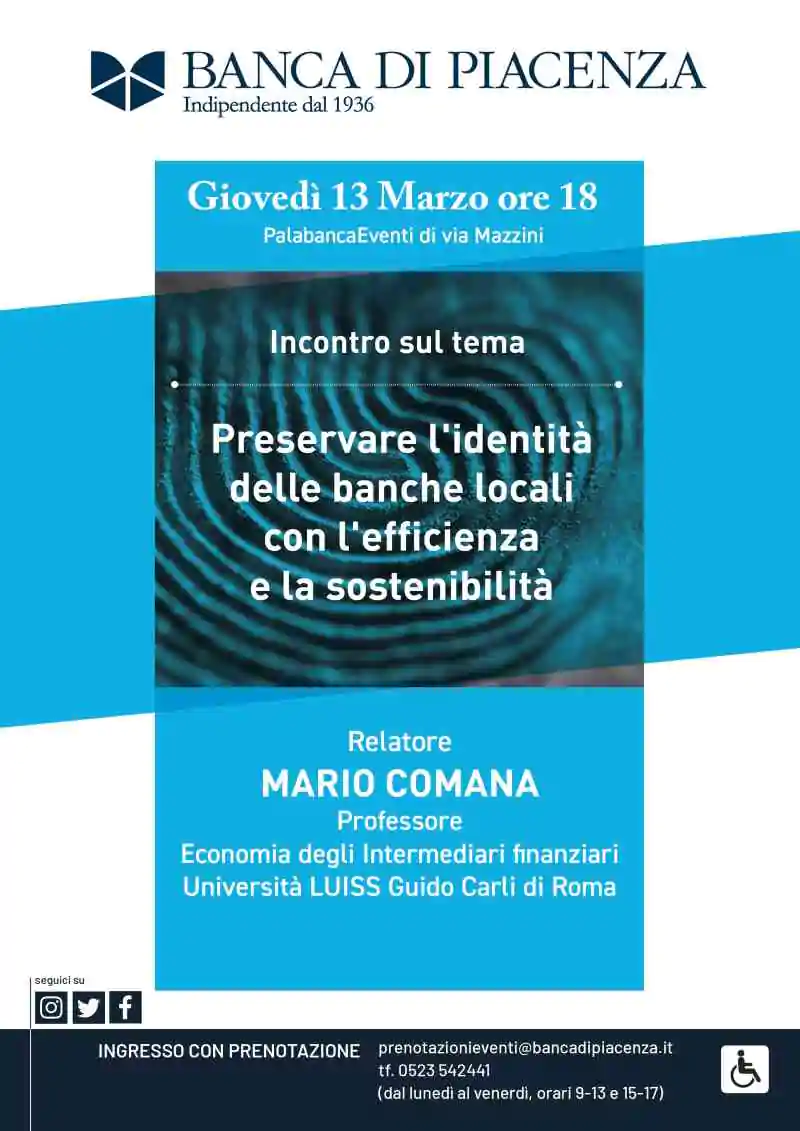 Giovedì 13 marzo, alle 18, al PalabancaEventi di via Mazzini, per iniziativa della Banca di Piacenza, appuntamento con la conferenza sul tema “Preservare l’identità delle banche locali con l’efficienza e la sostenibilità”. Relatore, il prof. Mario Comana, ordinario di Tecnica Bancaria presso il Dipartimento di Impresa e Management dell’Università Luiss Guido Carli di Roma; pubblicista economico (vicedirettore di Banche e Banchieri, editorialista di MF- Milano Finanza); coordinatore dei corsi di Economia degli intermediari finanziari del Master in Business Administration della Luiss – Scuola di Management; membro del comitato Scientifico del Cermef (Centro di Ricerche sui mercati finanziari), sempre della Luiss.
