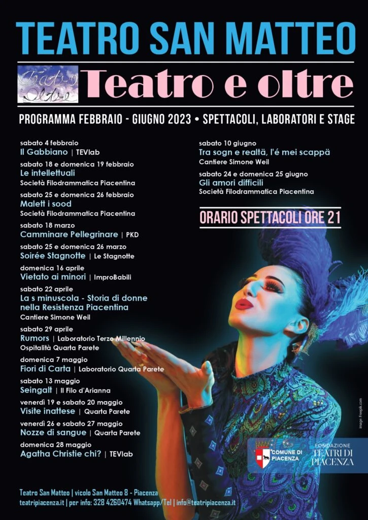 Presentato il primo cartellone condiviso, grazie alla collaborazione con l’Amministrazione comunale e la Fondazione Teatri, tra tutte le compagnie che fruiscono del Teatro San Matteo. A illustrare il dettaglio di spettacoli, laboratori e stage che si svolgeranno tra febbraio e giugno 2023 sono intervenuti l’assessore alla Cultura Christian Fiazza, Giada Antonucci per la Fondazione Teatri, Egidio Codeghini proprietario del Teatro San Matteo e i rappresentanti di tutte le realtà coinvolte: TEVlab, Società Filodrammatica Piacentina, Pkd, Le Stagnotte, ImproBabili, Cantiere Simone Weil, Il Filo d’Arianna e Quarta Parete.