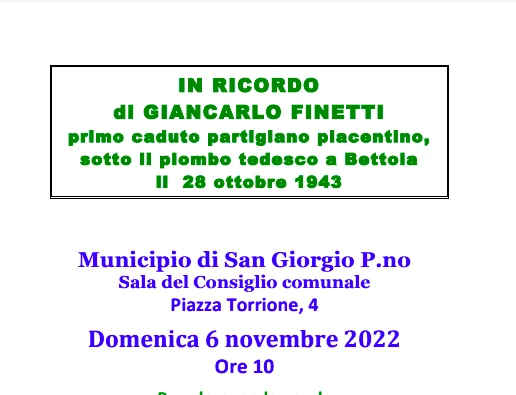 Domenica 6 novembre alle ore 10 nella sala consigliare del Comune di San Giorgio Piacentino è in programma una conferenza sulla figura del primo partigiano piacentino caduto a Bettola nell’ottobre 1943.