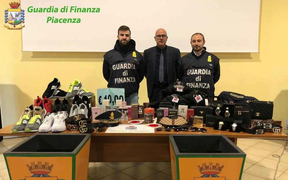In un caso il sequestro ha riguardato una cinquantina di capi, tra cui borse, occhiali, cinture, giubbotti e scarpe. Articoli recanti i famosi loghi; merce esposta per la vendita in una via del centro di Piacenza da un improvvisato venditore ambulante extracomunitario.