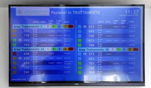 Altri familiari dei pazienti saranno invece invitati ad accomodarsi nella sala d’attesa dedicata e potranno seguire le fasi di presa in carico attraverso due monitor installati nell’area. Sul tabellone sarà infatti indicato se la persona è in attesa di esami ematici o radiografie o se sta aspettando una visita medica o i risultati delle diverse valutazioni. La privacy dei pazienti sarà garantita da codici numerici che permetteranno il riconoscimento della persona senza indicarne il nome.