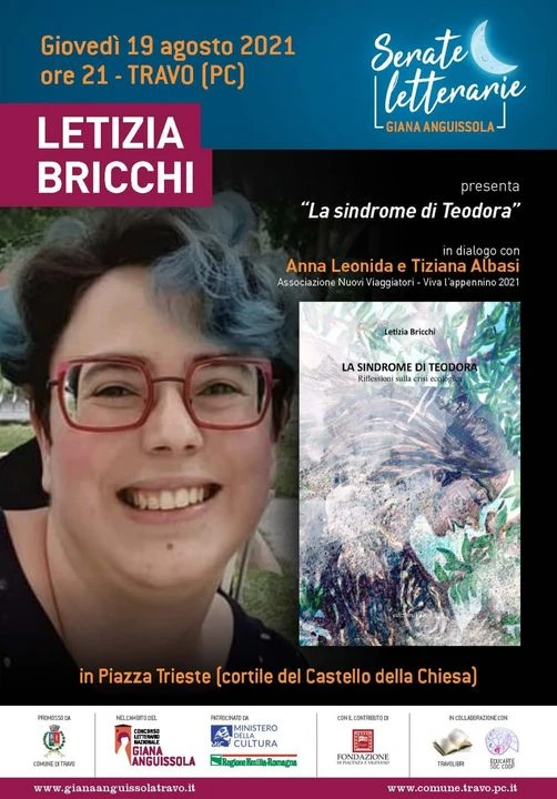 Dopo gli incontri di Marsaglia (7 luglio) e Bobbio (11 agosto), la prossima tappa sarà Travo, dove, giovedì 19 agosto alle 21.00, nella splendida cornice delle Serate letterarie Giana Anguissola, Anna Leonida e Tiziana Albasi dialogheranno con Letizia Bricchi autrice del libro “La sindrome di Teodora. Riflessioni sulla crisi ecologica” (LIR edizioni, 2020)
