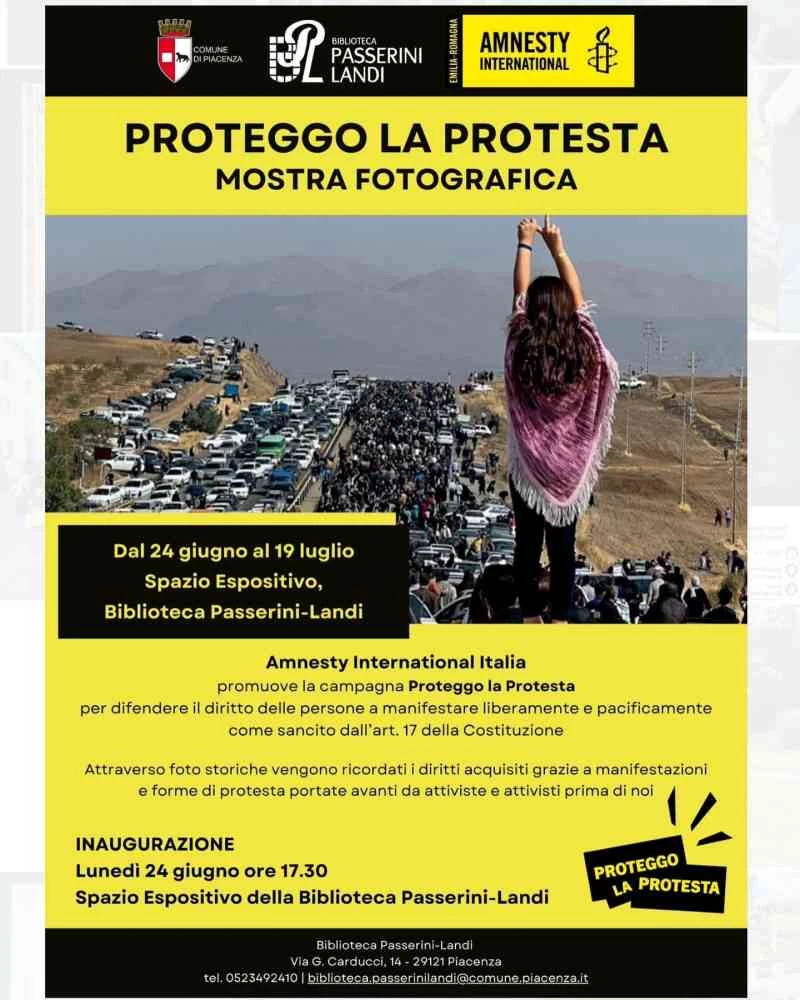 Si terrà lunedì 24 giugno, alle ore 17.30, presso lo spazio espositivo al piano terra della biblioteca Passerini Landi, l’inaugurazione della mostra di fotografie storiche “Proteggo la protesta”, organizzata da Amnesty International per ricordare i diritti acquisiti grazie alle grandi manifestazioni del passato.