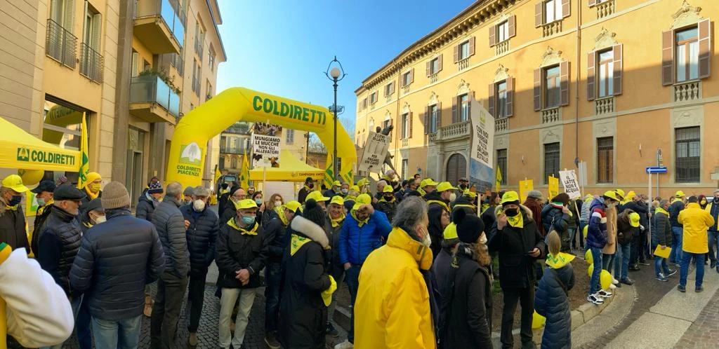 “Non possiamo produrre in perdita”, “Il latte delle nostre mucche è la vostra colazione”, “Il latte non è acqua”, “Mungiamo le mucche, non gli allevatori”, “Senza stalle la montagna muore”. Così gli allevatori piacentini danno voce alla situazione di grave difficoltà in cui versa il settore lattiero-caseario, durante la manifestazione organizzata da Coldiretti Piacenza questa mattina, giovedì 17 febbraio, davanti al Palazzo della Prefettura. Una mobilitazione che la Coldiretti ha attivato oggi in tutta Italia, da Nord a Sud, con agricoltori e allevatori scesi in piazza dalle campagne. In Emilia Romagna l’evento si è svolto a Piacenza, dove a guidare gli allevatori c’erano il direttore di Coldiretti Piacenza Roberto Gallizioli e i delegati confederali Giovanni Benedetti e Marco Allaria Olivieri. Presenti inoltre il delegato regionale di Coldiretti Giovani Impresa Andrea Degli Esposti e la responsabile di Coldiretti Donne Impresa Piacenza Francesca Bertoli Merelli.