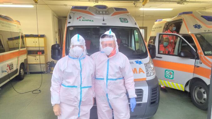 Presenti in sede, che si stanno vestendo per uscire per un trasporto ordinario (il primo di oggi è un signore positivo al Covid, quindi devono indossare le pesanti tute bianche), incontri Franco e Claudio, la coppia fissa del Lunedì, ed è con loro che ti fermi a parlare.