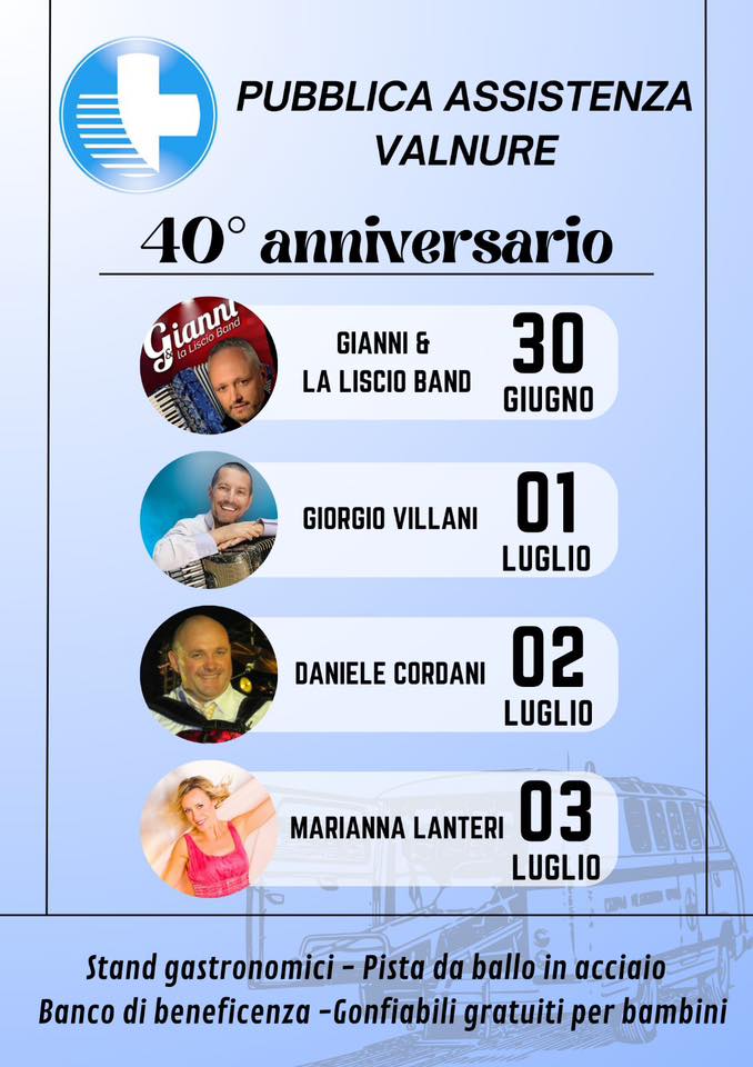 Pubblica Assistenza Valnure, grande festa per il 40° anniversario a Ponte dell’Olio dal 30 giugno al 3 luglio. Durante la manifestazione sarà possibile divertirsi con i gonfiabili gratuiti e gustare le prelibatezze degli stand gastronomici presenti. Inoltre per gli amanti del ballo: pista in acciaio per danzare il liscio con le orchestre.