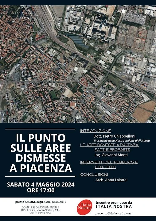 Aree dismesse a Piacenza da riutilizzare: un’enorme superficie, paragonabile a circa 100 campi da calcio. Il tema sarà analizzato sabato 4 maggio alle ore 17 nell’incontro al Salone degli Amici dell’Arte. Pietro Chappelloni Presidente della sezione di Piacenza di Italia Nostra, ne ha parlato a Radio Sound.